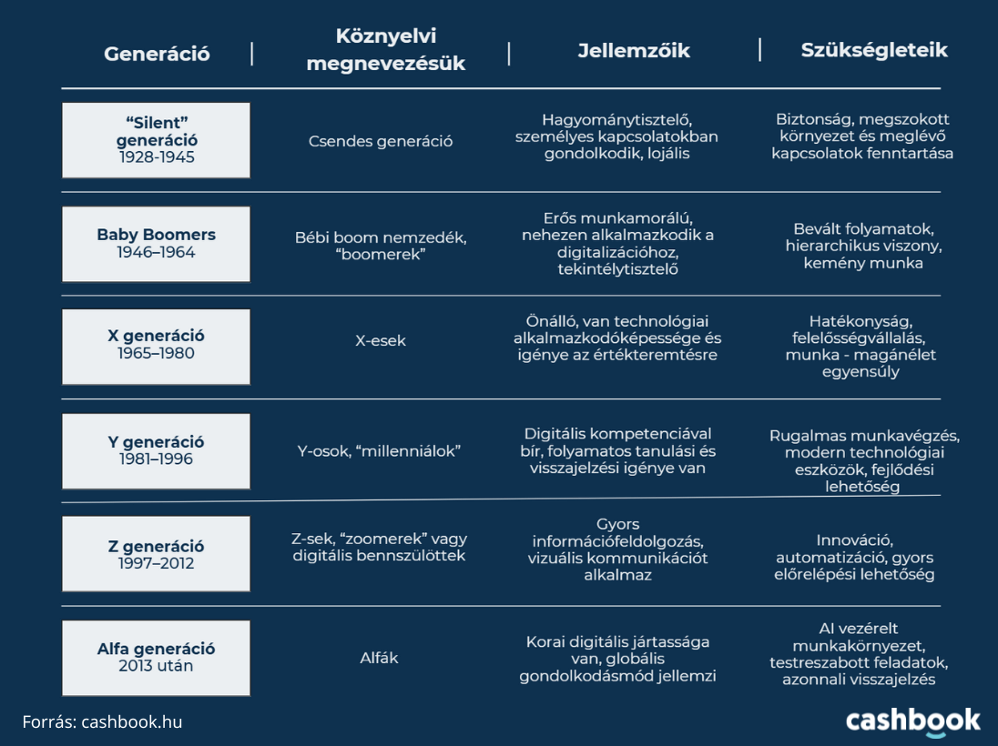 A munkaerőpiacon jelenleg a kései Boommerektől a korai Z-sekig terjedő négy generáció képviselteti magát. Munkáltatóként különösen, de munkavállalóként is igaz, hogy feladatunk e szűk 50 év szülöttei között kialakítani egy olyan stabil kommunikációs hidat, amin járva könnyebbé válik a közös munka. Érdemes feltenni a kérdést magunknak: “Mit tudok tenni azért, hogy jobban értsem a kollégámat, vezetőmet, gyerekemet stb?”