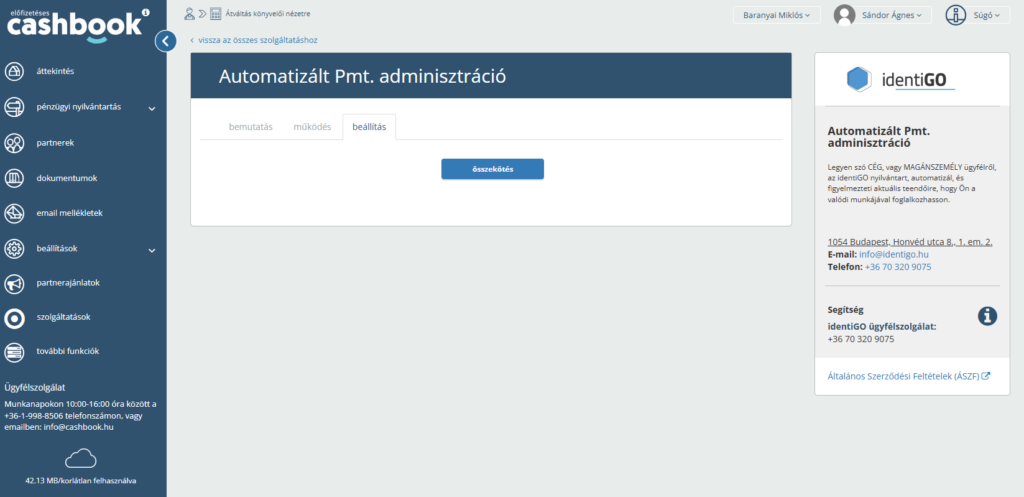 Az identiGO pár egyszerű lépésben összeköthető a Cashbook fiókkal, a Cashbookban található „Szolgáltatások” menüpontban az Identigo „összekötés” gombra kattintva.