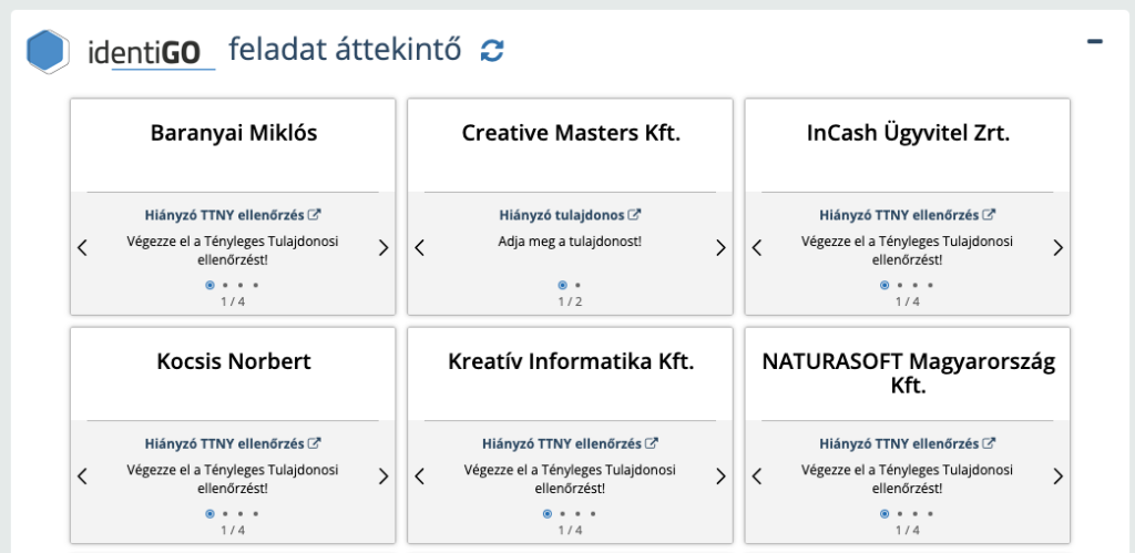 Az identiGO integráció révén a Cashbook rendszerében azonnal látható lesz, ha a pénzmosás elleni megfeleléssel kapcsolatban teendő merül fel egy vállalkozásnál.