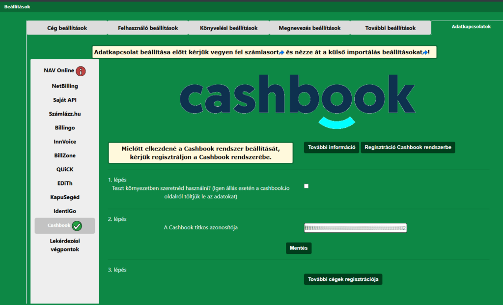 4. Ezzel kész is a regisztráció, és a könyvelő programod is össze van kötve a Cashbookkal.