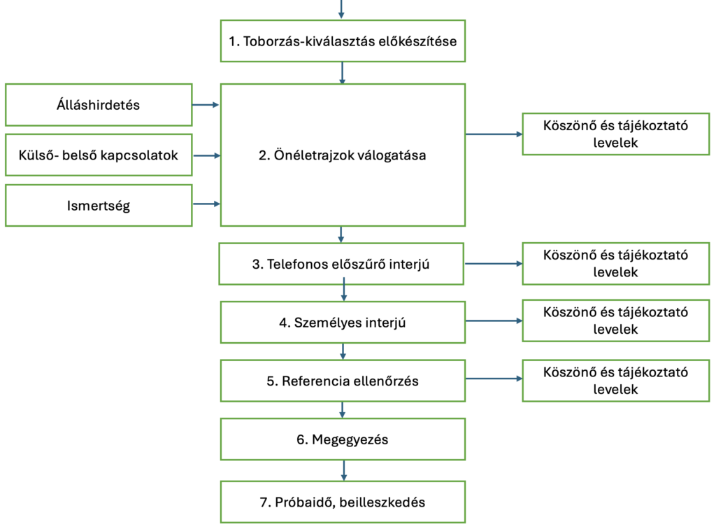 A sikeres munkatárs felvétel minimuma a fent látható folyamat, amely minden egyes lépése kritikus fontosságú.